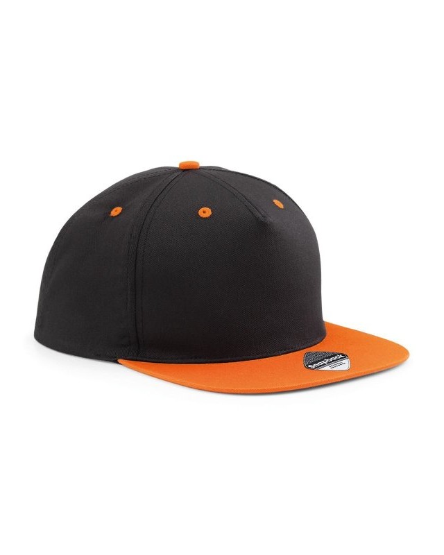 100% cotone twill. Cappellino a 5 pannelli in stile rap con visiera piatta e dettagli a contrasto, regolazione con snap-tab, etichetta strappabile, taglia unica.