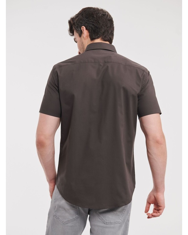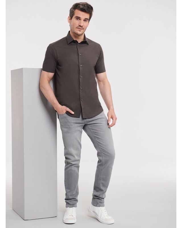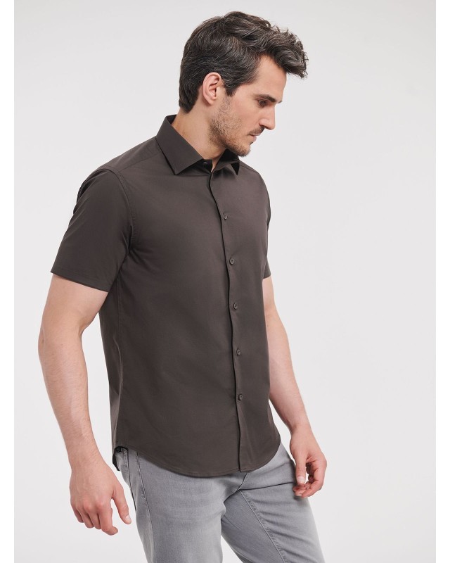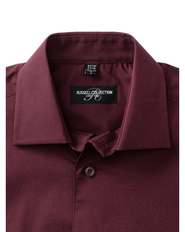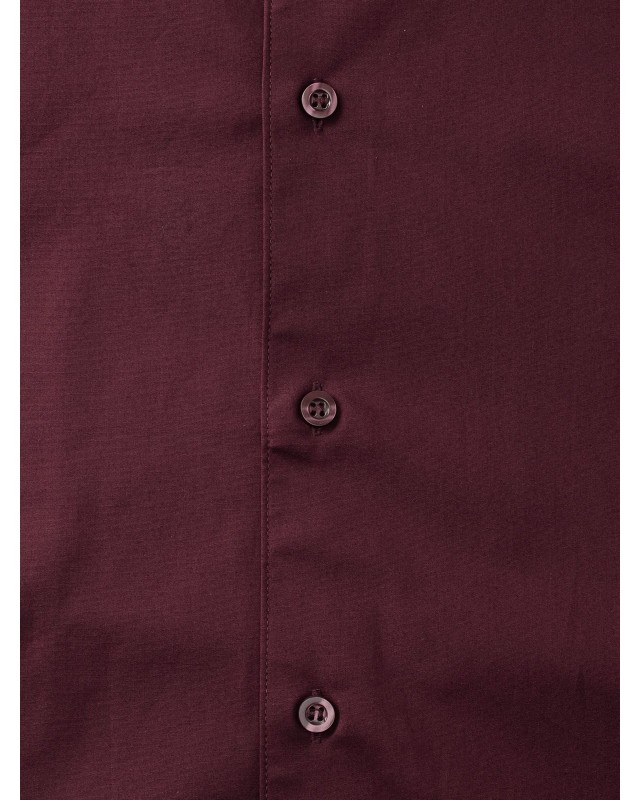 97% cotone 3% elastan. Camicia elegante, colletto semiaperto con bottone singolo perlato, orlo stondato. Bottone di riserva.