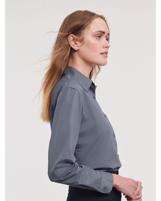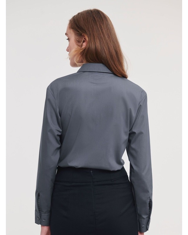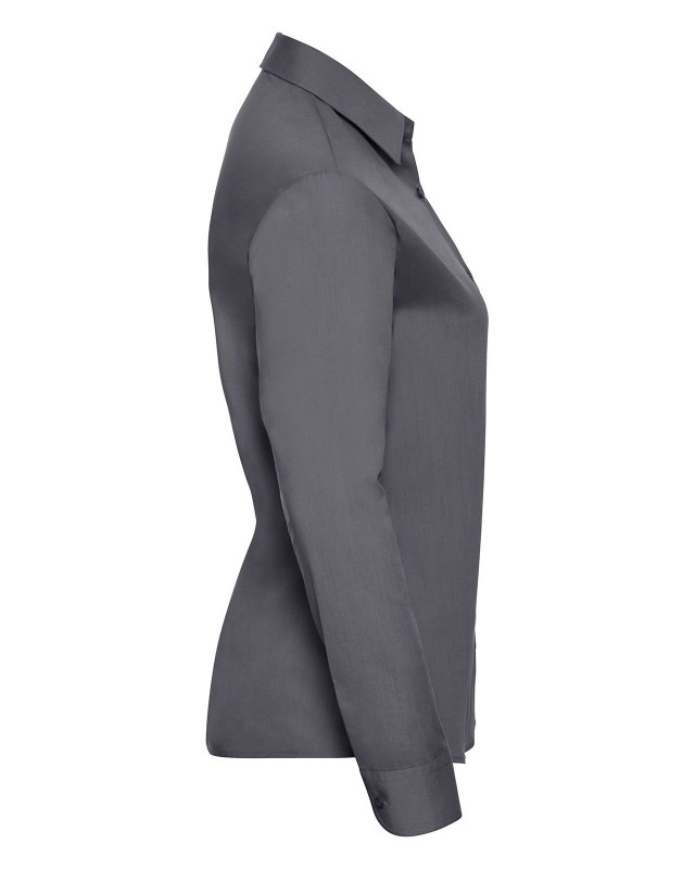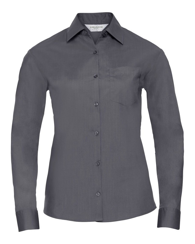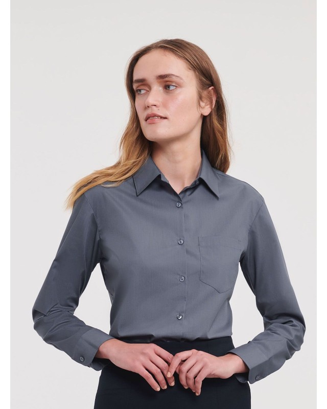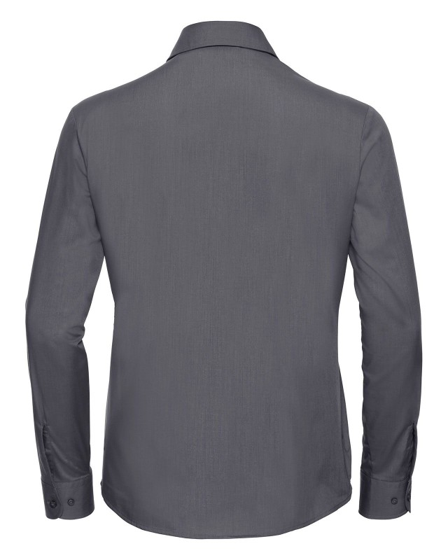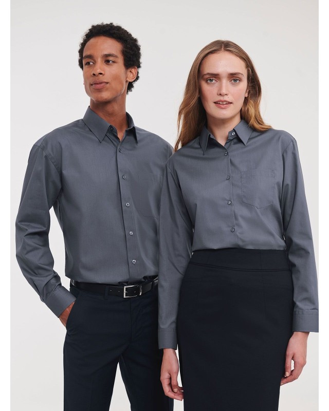 65% poliestere 35% cotone. Camicia in popeline con colletto classico con stecche, taschino a v, orlo stondato. Polsini stondati con due bottoni regolabili. (Col. 30: 110g/m�).