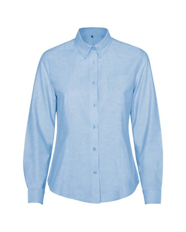 Camicia donna con tasca sul petto a sinistra. Pattina con bottoni. Colletto con bottoni. Polsini con due fascette. Piega sulla schiena. Cuciture sul petto e forma sfiancata. - Genere: Donna - Composizione: 70% cotone / 30% poliestere, tessuto Oxford, 140 g/m². - *Duo concept.