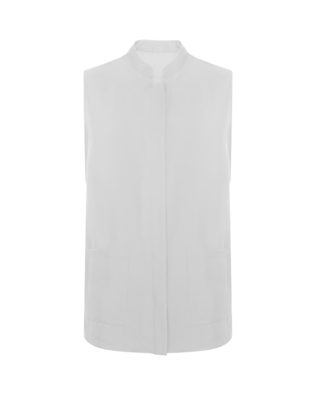 Cappotto senza maniche da donna. Chiusura centrale con bottoni a pressione nascosti. Collo Mao, cuciture laterali e pinces sul petto. Due tasche frontali applicate. - Genere: Donna - Composizione: 100% poliestere, 130 g/m². - * Etichetta removibile