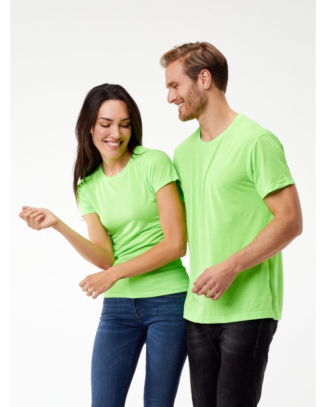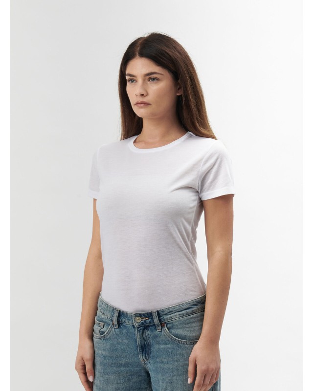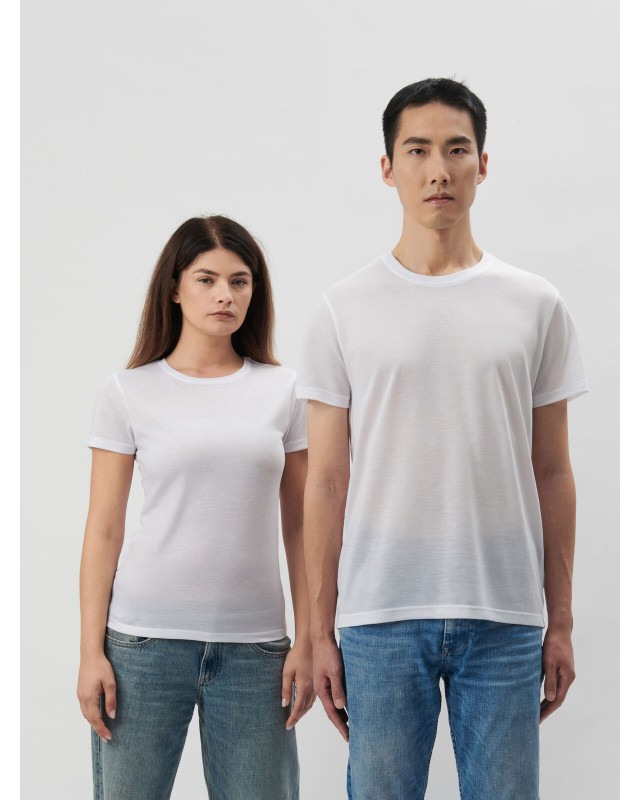 100% poliestere. T-shirt a maniche corte, struttura con cuciture laterali, costina in elastan a doppio strato, nastro di rinforzo alle spalle, etichetta satinata.