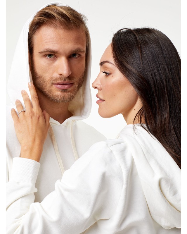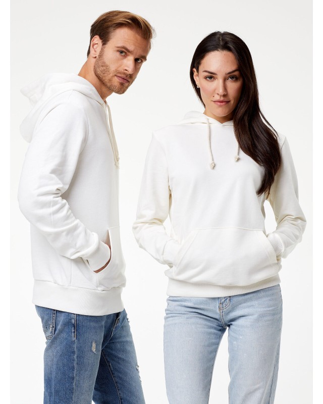 Felpa con cappuccio 100% cotone pettinato French Terry. Manica dritta, fit moderno, struttura con cuciture laterali, cappuccio doppio, tasca a canguro, collo senza etichetta, ma con un piccolo adesivo taglia, etichetta composizione, taglia e made in Italy sul fianco. Non felpata internamente. Colore NTR adatto per tinto in capo Prodotta in Italia