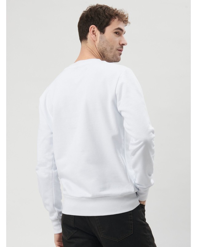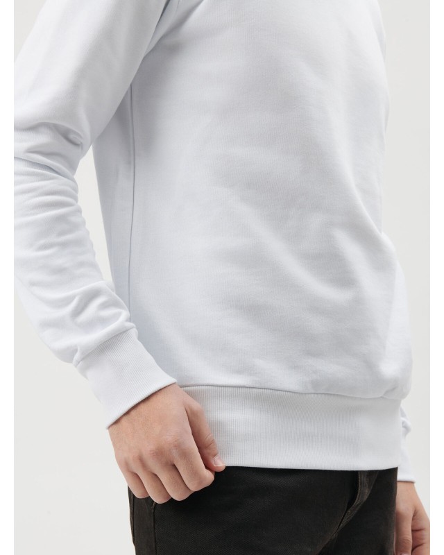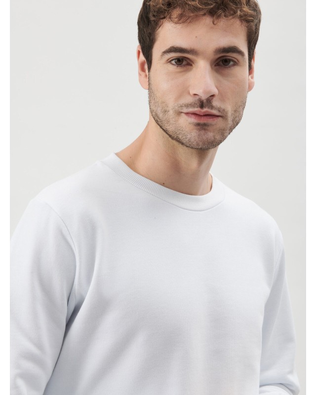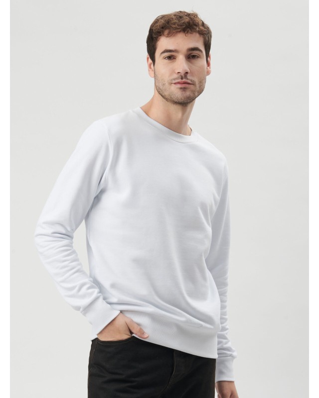 Felpa girocollo 100% cotone pettinato French Terry. Manica dritta, fit moderno, struttura con cuciture laterali, collo senza etichetta, ma con un piccolo adesivo taglia, etichetta composizione, taglia e made in Italy sul fianco. Non felpata internamente. Colore NTR adatto per tinto in capo Prodotta in Italia