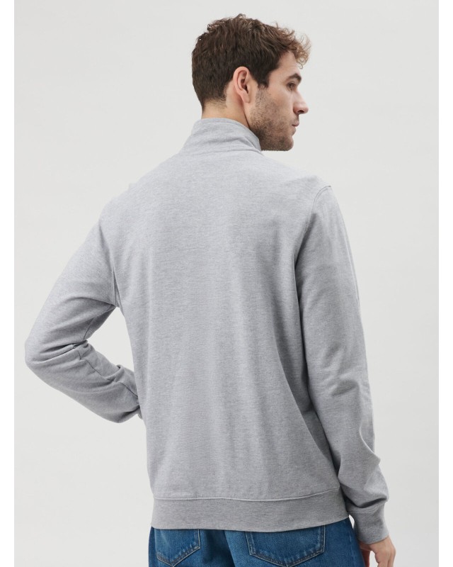 80% cotone 20% poliestere. Felpa french terry con zip intera, maniche set-in, collo alto, tasche a filetto. Orlo inferiore e polsini in costina, struttura con cuciture laterali. Etichetta strappabile. Parte esterna: 100% cotone, parte interna: 50% cotone, 50% poliestere.