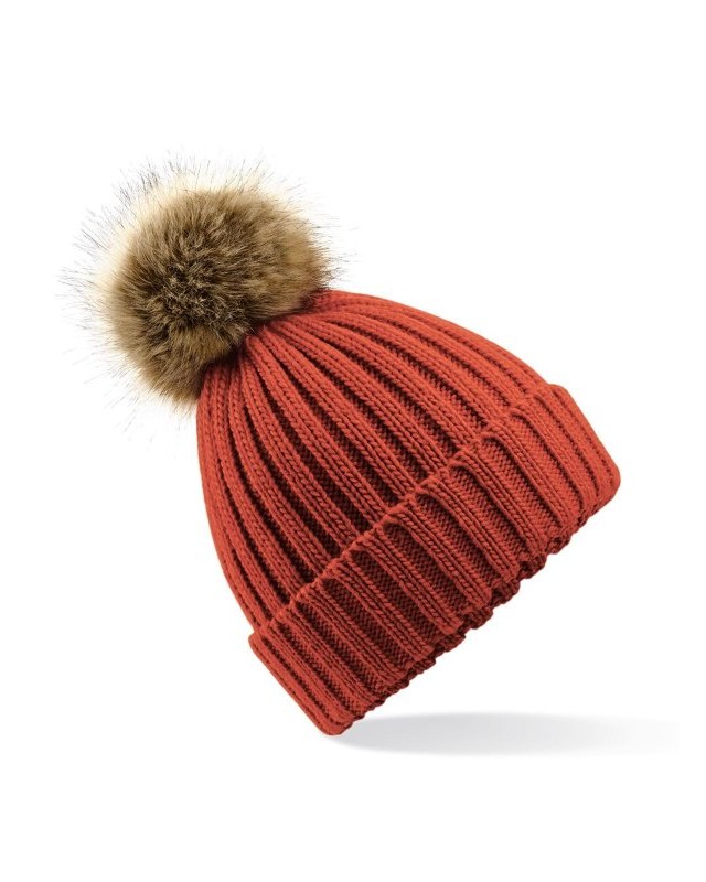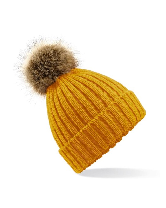 100% acrilico soft-spun. Cuffia modello unisex in coste di filato pesante, design con risvolto, pon-pon in pelliccia ecologica rimovibile, taglia unica.