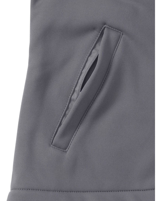100% poliestere rivestito in DuPontTM Teflon DWR(Durable Water Resistance). Giacca in softshell a doppio strato, altamente traspirante e resistente a vento e acqua. Due tasche con zip, interno in micropile.