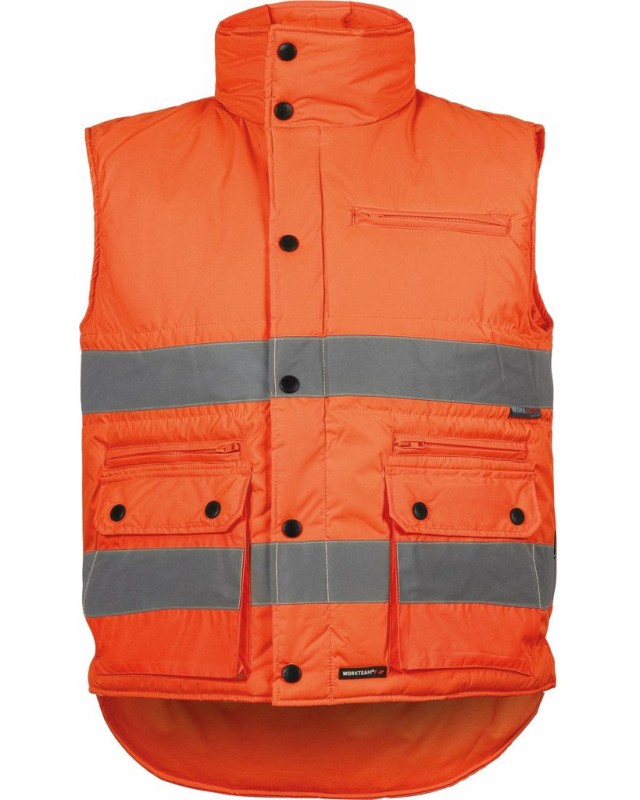 Gilet imbottito certificato alta visibilità con cerniera nascosta da risvolto con bottoni automatici e collo alto.