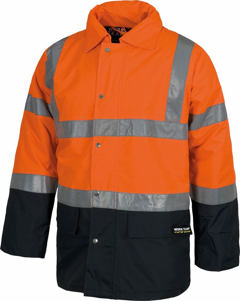Parka impermeabile imbottito bicolore certificato alta visibilità con cerniera in nylon nascosta da risvolto con bottoni automatici.