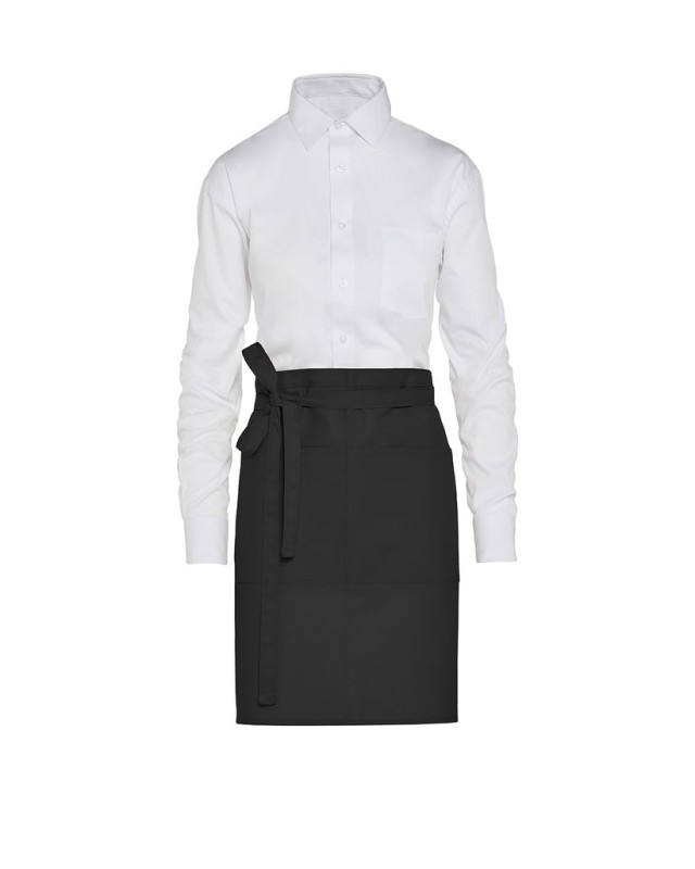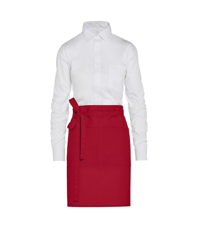 ·205 g/m² ·65% poliestere (riciclato), 35% cotone (riciclato) ·Twill fine ·Resistente al lavaggio ·Facile manutenzione ·Tintura reattiva ·Robusti lacci del grembiule in vita ·Grande tasca centrale cucita con 2 scomparti (40 x 20 cm) ·Lunghezza corta ·Dimensioni: 78 x 52 cm ·Lavabile fino a 60°C.