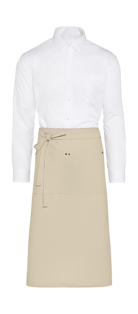 ·280 g/m² ·100% cotone ·Fine Twill Canvas ·Grembiule trendy dal look fashion ·Resistente al lavaggio ·Tintura reattiva ·Lacci in vita ·Grande tasca centrale cucita con 2 scomparti (40 x 20 cm) ·Rivetti in ottone antico sulle tasche (inossidabili e antiruggine) ·Lunghezza media ·Dimensioni: 100 x 78 cm ·Lavabile fino a 60°C.