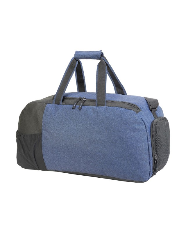 ·100% poliestere (600D Melange/600D) ·manici per il trasporto palmati ·tracolla regolabile in tessuto ·scomparto principale con zip ·tasca laterale (per scarpe) con zip ·tasca frontale con zip ·tasca in rete ·base interna ·Capacità: 40 litri ·Dimensione: 58 x 30 x 25 cm ·Adatto per serigrafia, stampa transfer e ricamo ·Max. area per ricamo: telaio tubolare 14 ·Max. area di stampa: 20 x 12 cm