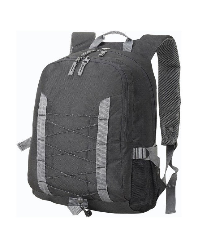 ·100% poliestere (600D Rip-stop) ·zaino con 2 scomparti ·scomparto principale con tasca interna per lettore MP3/iPod ·apertura in gomma per auricolari ·tasca organiser per penne telefono ecc. nello scomparto anteriore ·2 tasche laterali portabottiglie in mesh ·cordoncini frontali ·bretelle imbottite regolabili ·capacità: 26 Litri ·dimensioni: 30 x 43 x 22 cm ·massima superficie per il ricamo: cerchi tubolari 11 ·area per la decorazione: 12 x 9 cm ·adatto per stampa serigrafica / stampa transfer e ricamo