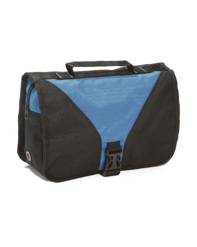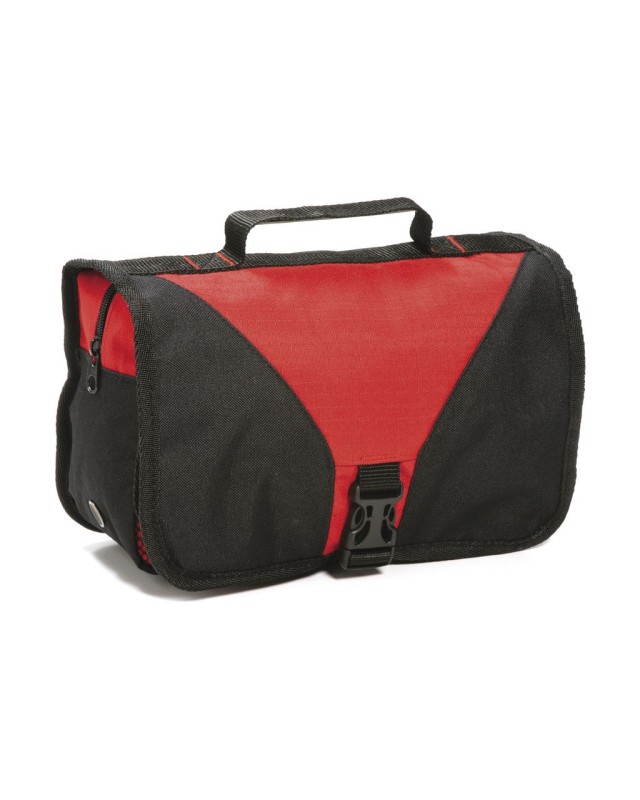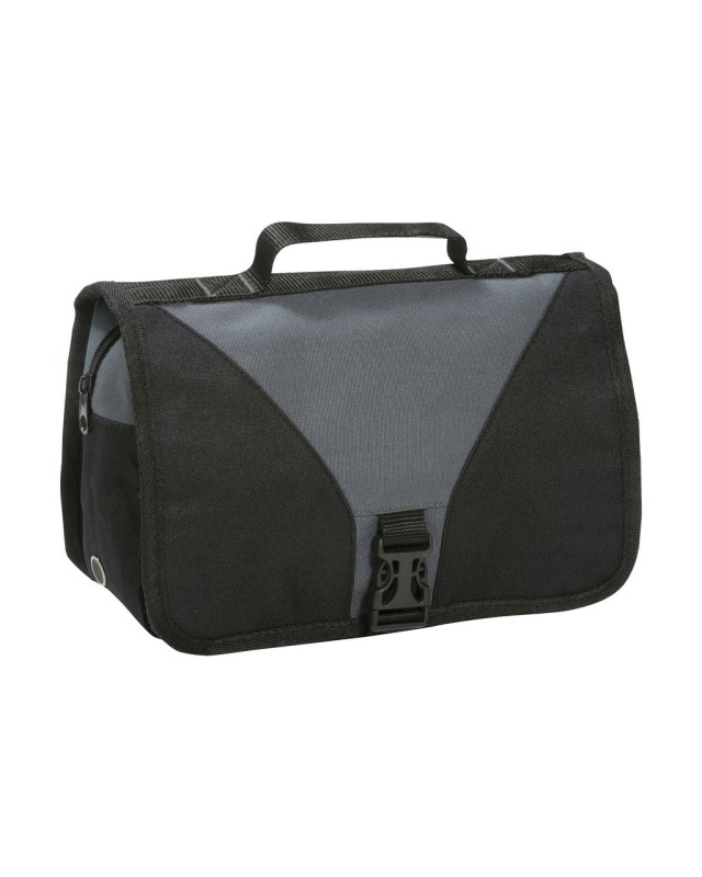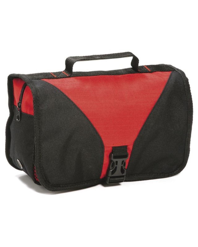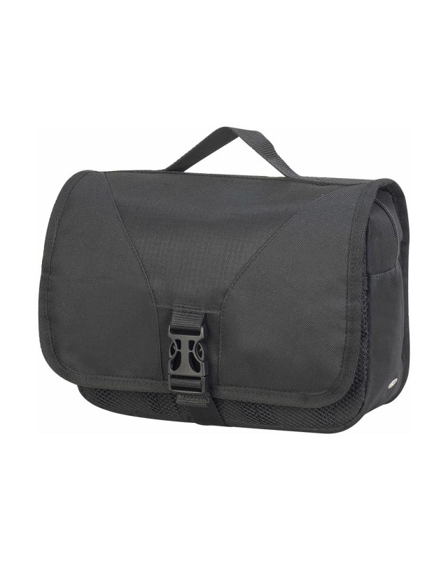 ·100% poliestere (600D/600D Rip-stop) ·maniglia ·gancio per appendere la borsa ·ampio scomparto principale con zip ·tasche interne in mesh ·2 ulteriori tasche con zip sulla patta ·specchio interno ·borsello toilette pieghevole ·peso: 300 g ·capacità: 4 Litri ·dimensioni: 27 x 17 x 9 cm ·massima superficie ricamabile: cerchi tubolari 8 ·area per la decorazione: 9 x 8 cm