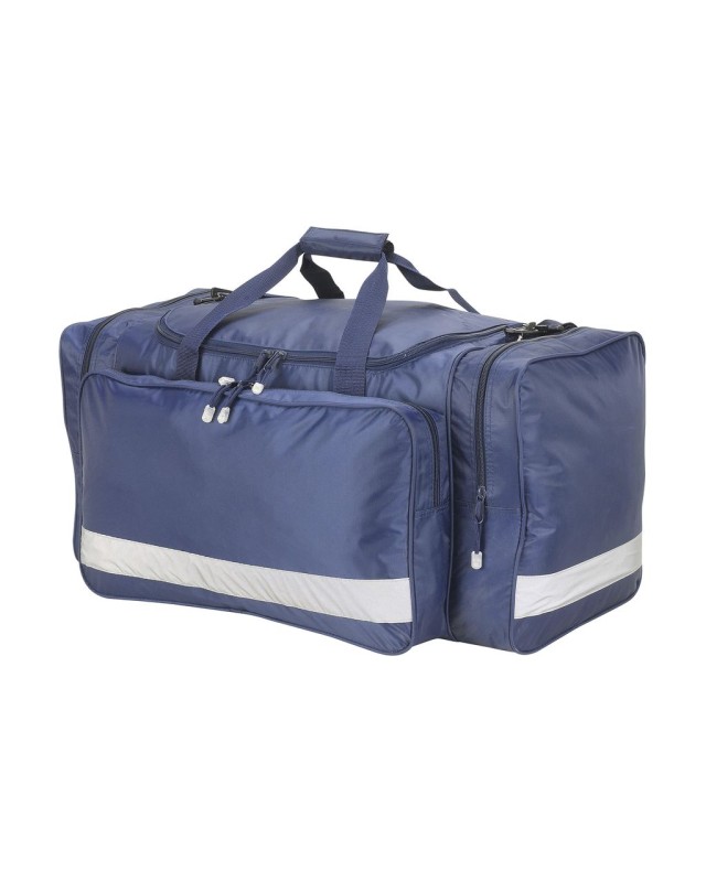 ·100% poliestere (420D) con fodera impermeabile in PVC ·ampio scomparto principale ·2 tasche alle estremità ·ampia tasca frontale ·bande riflettenti su tre lati ·maniglie di trasporto rinforzate con chiusura a strappo ·tracolla regolabile ·capacità: 75 Litri ·dimensioni: 68 x 35 x 32 cm ·massima superficie ricamabile: cerchi tubolari 14, 15, 20 ·area per la stampa: 35 x 20 cm, 28 x 22 cm, 38 x 32 cm