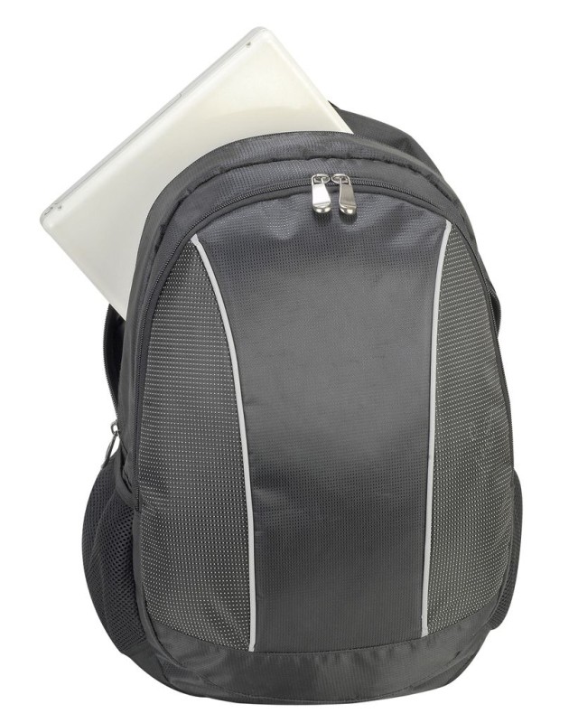 ·100% poliestere (jacquard/600D) ·maniglia per il trasporto ·bretelle imbottite regolabili ·scomparto principale adatto per laptop fino a 15.6 ·secondo scomparto con zip per accessori con sezione organiser ·cerniera nascosta sul retro con vano che può essere raggiunto solo quando la borsa non si trova sulle spalle (anti ladro) ·bordino riflettente anteriore ·2 tasche in rete laterali ·Adatto per stampa serigrafica, stampa transfer e ricamo ·Capacità: 27 Litri ·massima superficie per il ricamo: cerchi tubolari 11 ·massima superficie per la stampa: 12 x 15 cm ·Dimensioni: 31 x 44 x 20 cm