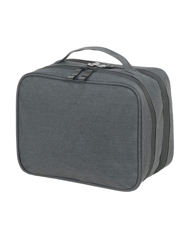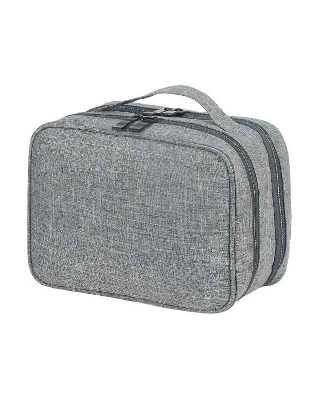 ·100% poliestere (600D, Mélange) ·Pratica custodia per accessori o borsa da viaggio ·Maniglia superiore ·Uno scomparto principale con tasca interna con zip ·Uno scomparto principale con cinturino in gomma per tenere gli accessori ·Capacità: 5 litri ·Dimensioni: 25 x 12 x 19 cm ·Adatto per transfer, serigrafia o ricamo ·Max. ricamo: telaio tubolare 10 ·Max. area di stampa: 17 x 12 cm.