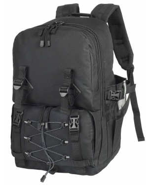 ·100% poliestere (600D) ·Zaino spazioso da escursionismo con maniglia ·Bretelle imbottite regolabili e pannello posteriore imbottito ·Ampio scomparto principale con cerniera ·Due scomparti più piccoli sul davanti con zip ·Due grandi tasche laterali ·Cinghie di compressione sul davanti e sui lati ·Due cinghie regolabili e cordino elastico che si incrociano sul davanti, per consentire il montaggio dell`attrezzatura fuori dalla borsa ·Strisce riflettenti ·Adatto per serigrafia, stampa transfer o ricamo ·Capacità: 40 Litri ·Dimensioni: 35 x 50 x 23 cm ·Ricamo massimo: telaio tubolare 15 ·Area di decorazione: 15 x 18 cm