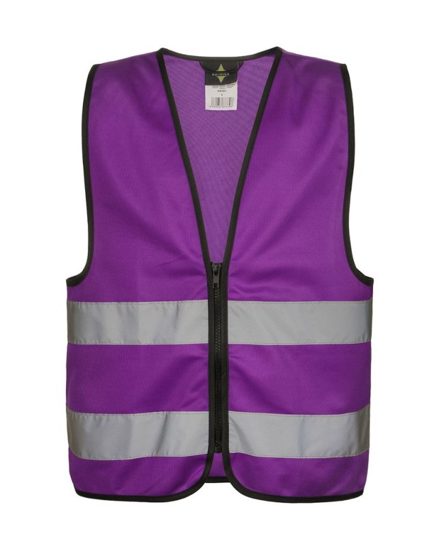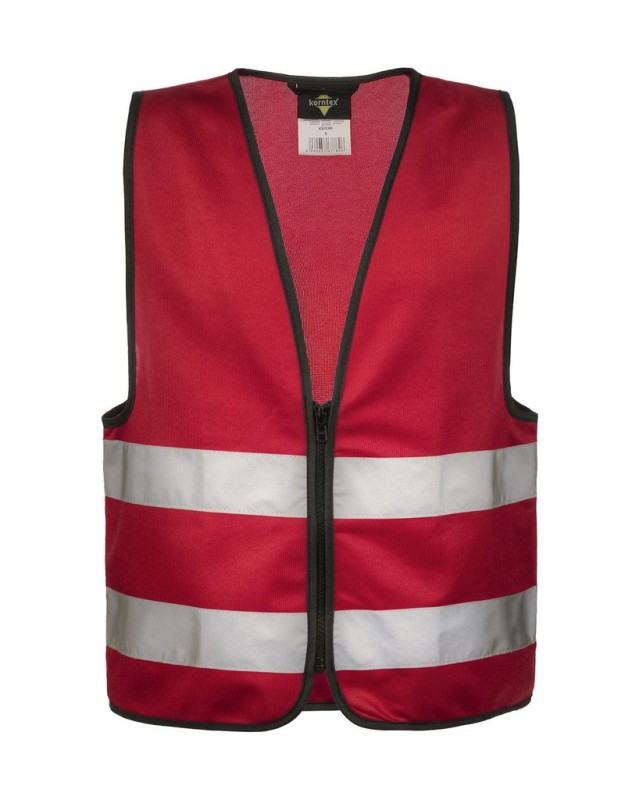·100% poliestere ·Bordi rilegati neri ·Cerniera intera sul davanti ·Strisce orizzontali riflettenti (larghezza 5 cm) davanti e dietro ·EN 17353:2020 ·Confezionato singolarmente in sacchetto di plastica
