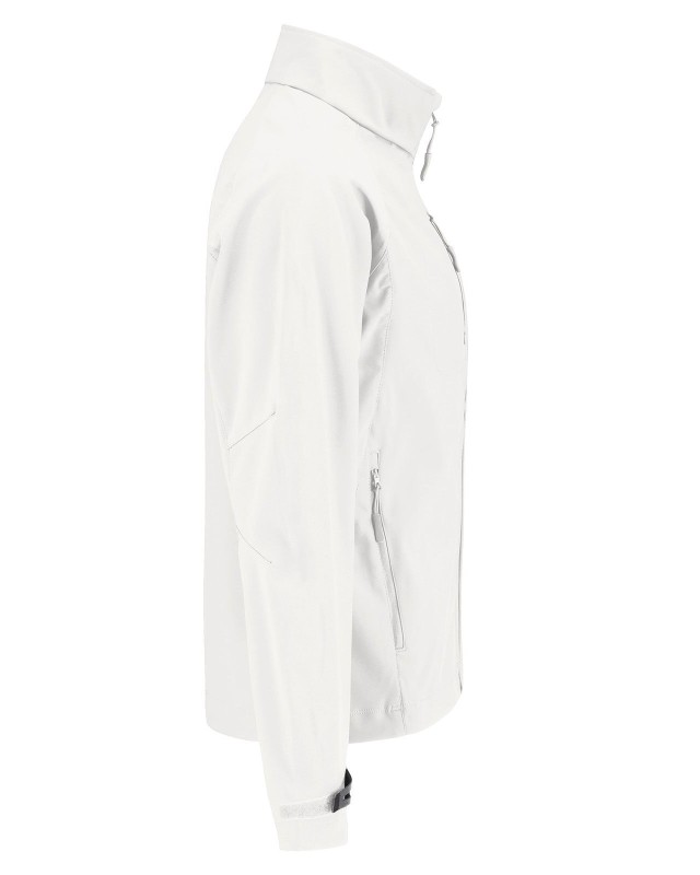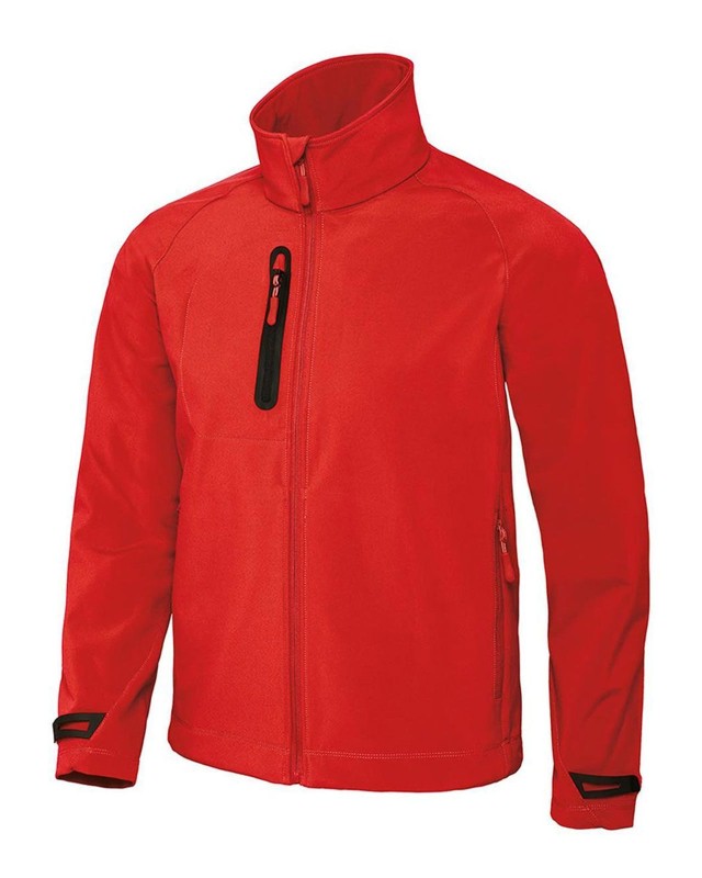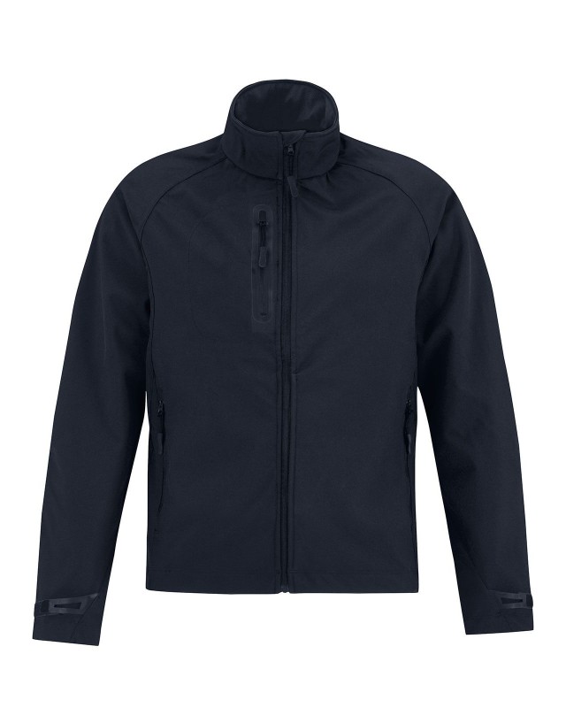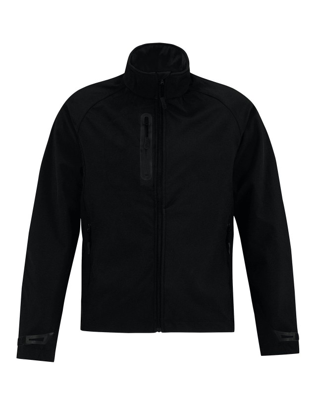 94% poliestere, 6% elastane. Giacca in Softshell a 3 strati, dotata di membrana traspirante, con microfori, parte interna 100% poliestere, in maglia. Taschino al petto con zip e passante interno, 2 tasche laterali con zip, protezione per il mento, velcro sui polsini per regolarli, cordino interno in vita elasticizzato e stopper.