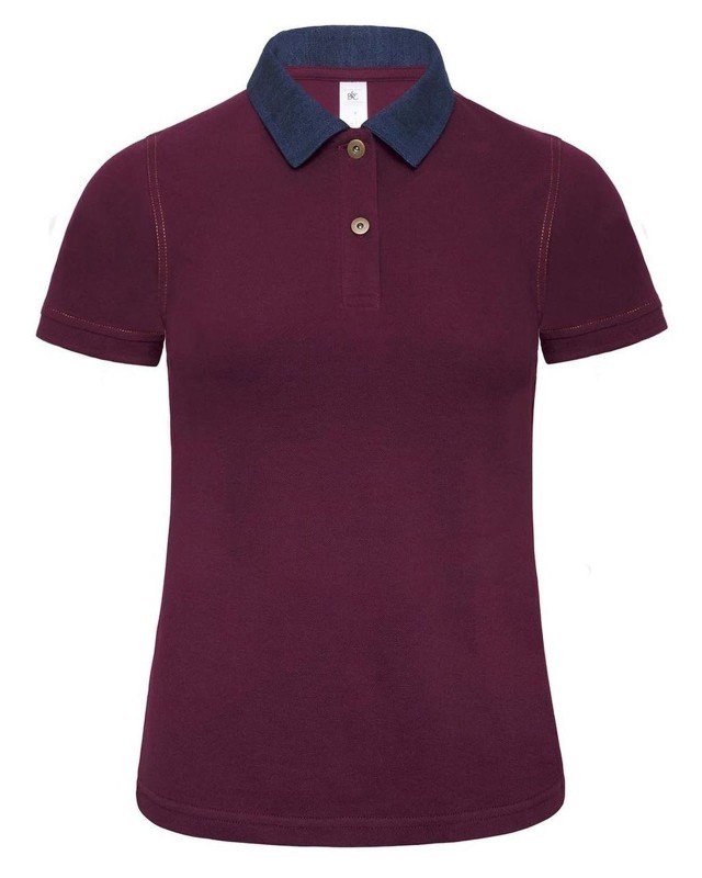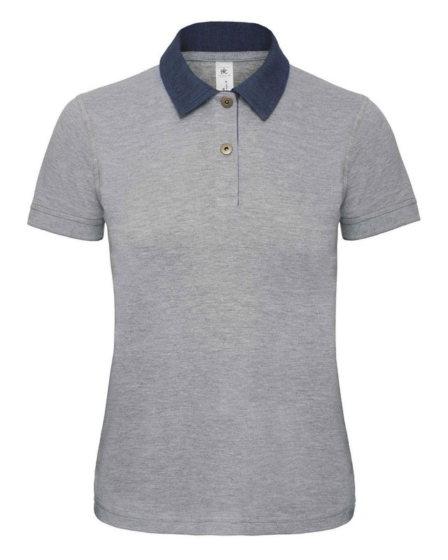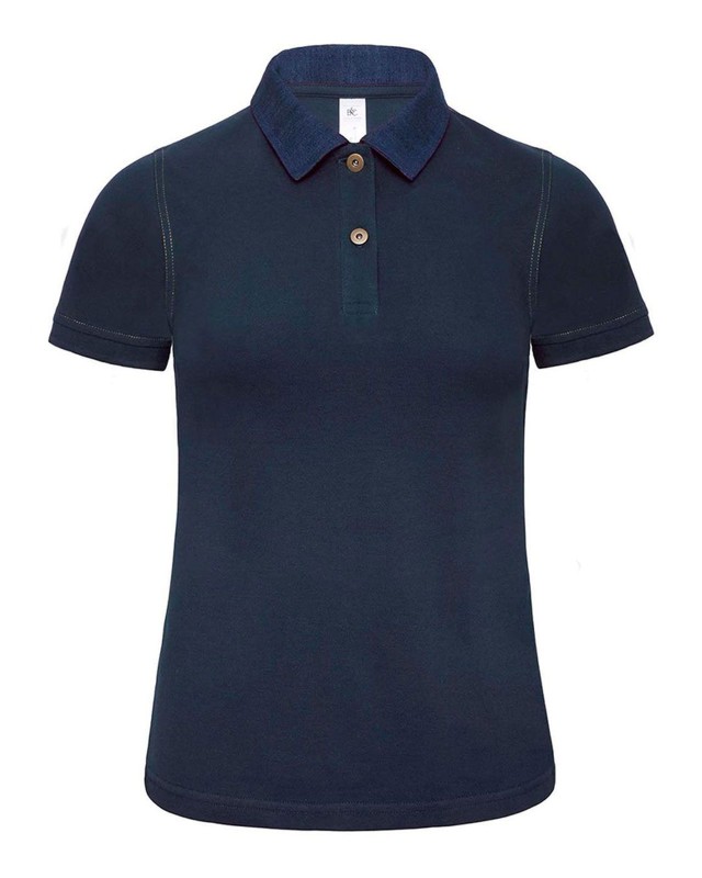 100% cotone ring-spun piqué. Polo a maniche corte set-in, colletto in denim con due bottoni in ottone anticato, cuciture di colore contrastante, leggermente sfiancata, struttura con cuciture laterali. Col. DH933: 90% cot. 10% vis.