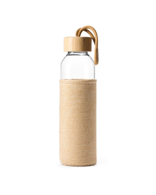 Bottiglia in vetro con originale coperchio in juta simulata e tappo in bambù con pratica impugnatura per il trasporto. Capacità 500 ml. - Misure: [22,5cm/6,4Ø] - Composizione: Cristal, yute y bambú - Antigocciolamento.Confezione in scatola dal design ecologico.