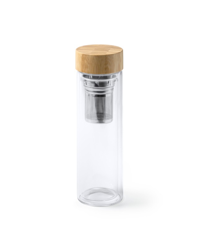 Borraccia in vetro borosilicato a doppia parete con coperchio in bambù. Include infusore per tè, in modo da poterlo bere ovunque. Capacità 420 ml. - Misure: [23,9cm/7Ø] - Composizione: Cristal borosilicato - Confezione in scatola dal design ecologico.