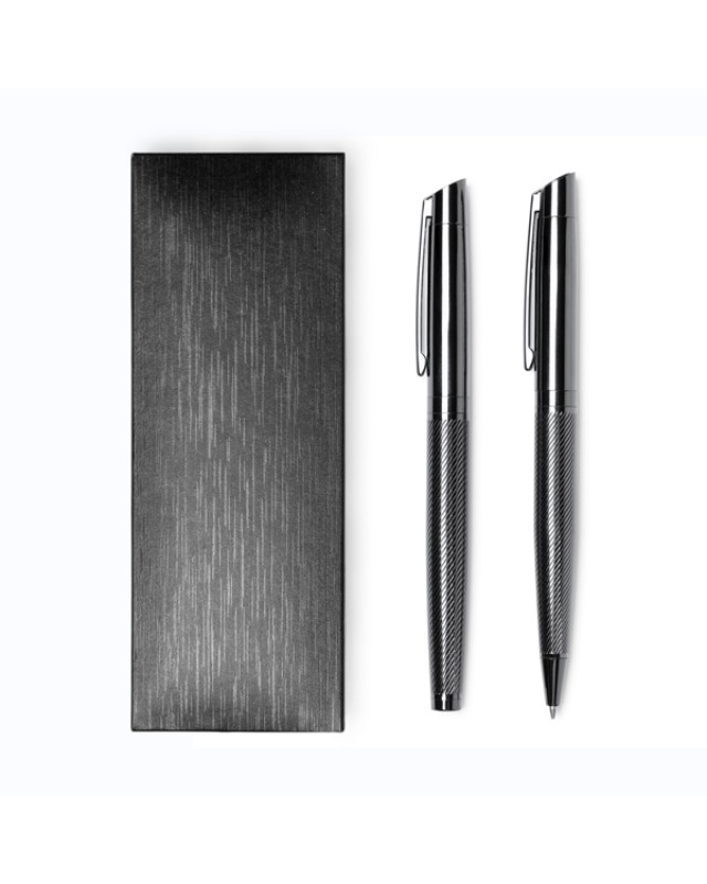 Elegante set di penna roller a rotazione e matita a scatto, con design in acciaio scuro. Confezione in custodia di pelle imbottita con fodera interna. Inchiostro blu. - Misure: [13,6cm/1,1Ø] - Blue ink.