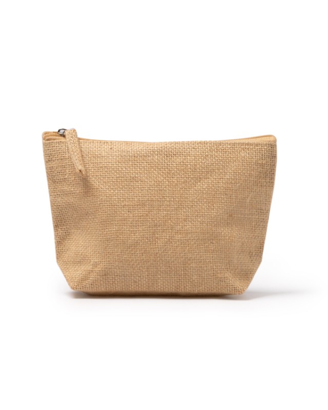 Beauty case in juta con zip in tinta e tiretto in juta. - Misure: [22cm/6,5cm/14cm] - Composizione: Juta laminata. - Etichetta cucita all'interno.