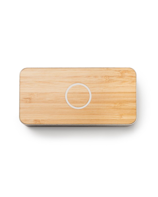 Cassa Bluetooth con base di ricarica wireless. Questo caricabatterie è stato progettato con un corpo in fibra di grano e una superficie in bambù. Ha una potenza 5W e un'uscita wireless da 10W. Include una batteria ricaricabile. - Misure: [16cm/6cm/7,8cm] - Composizione: Fribra di grano e di bambù naturale - Versione Bluetooth: 5.0Tensione di carica: 5VRicarica wireless: 2A, 10WBatteria al litio 1200 mAh, 3,7VDurata: 4-5 oreDistanza di funzionamento: fino a 10 metriFrequenza: 280Hz-16KHzImpedenza: 4 ohmPotenza: 5WTHD: meno del 3%SNR: > 65dBInclude cavo di ricarica.Manuale di istruzioni in 6 lingue: spagnolo, inglese, francese, italiano, tedesco e portoghese.Confezione in scatola di design ecologico.