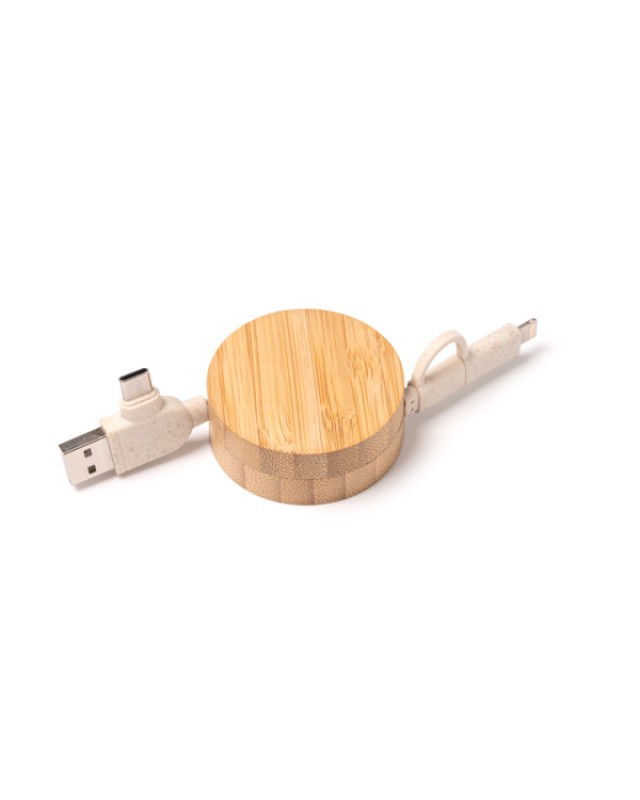 Cavo di ricarica estensibile con struttura principale in bambù e cavo in fibra di grano. Ingressi USB e di tipo C. Uscite lightning e di tipo C. Presentazione in una busta individuale di design ecologico. - Misure: - Composizione: Bambú - Presentación en sobre individual diseño eco.