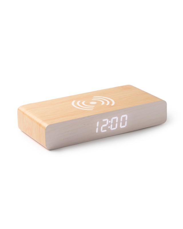 Orologio con caricabatterie wireless da 5W in legno MDF, con 3 modalità di illuminazione. Dispone di altre funzioni aggiuntive: ora, data, sveglia e temperatura. È possibile impostare fino a 3 allarmi indipendenti. Cavo di ricarica USB incluso. - Misure: [16cm/2,9cm/7,5cm] - Composizione: Legno - Confezione in scatola di design ecologico.Potenza in ingresso: DC5V-2APotenza in uscita: 5V-1ACaricabatterie wireless compatibile con i dispositivi mobili con tecnologia QI.Include 2 pile a bottone (LR1130) per la memoria di configurazione.Include cavo di ricarica USB.