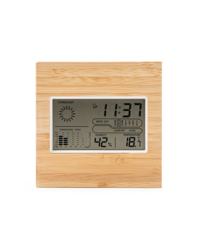 Stazione meteorologica con pannello frontale in bambù. Funzione di orologio, calendario e sveglia con sensori di temperatura e umidità. Registrazione della temperatura e dell'umidità massima e minima. Funziona con 2 batterie AAA (non incluse). - Misure: [13cm/13cm/2,4cm] - Composizione: Bambú - Confezione in scatola di design ecologico. Funziona con 2 batterie AAA (non incluse).Materiale dell'alloggiamento: ABSMateriale del pannello frontale: bambùIntervallo di temperatura: 0 - 50ºCIntervallo di umidità: 20% - 99%Intervallo calendario: 2000 - 2099Manuale di istruzioni in 6 lingue: spagnolo, inglese, francese, italiano, tedesco e portoghese.
