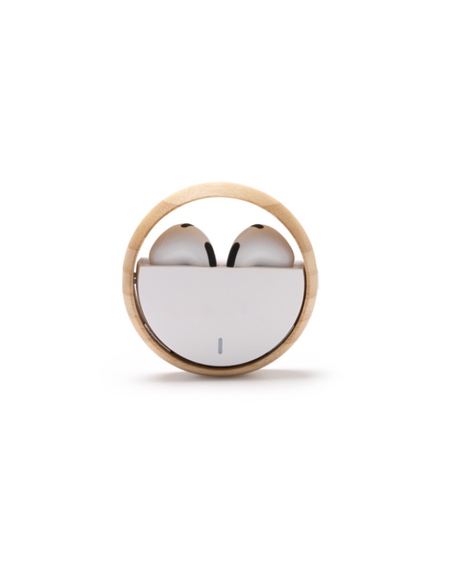 Auricolari wireless contenuti in una custodia in ABS riciclato con cornice protettiva girevole. Pannello di controllo integrato con tecnologia touch. Funzione mani libere. Batteria ricaricabile. Cavo di tipo C incluso. Confezione in scatola di design ecologico. - Misure: [6cm] - Composizione: ABS reciclado y bambú - Versión Bluetooth: 5.3Frecuencia Bluetooth: 2.4GHzDistancia de funcionamiento Bluetooth: 10 metrosPotencia de entrada: DC 5VPotencia de salida: 10mWBatería de los auriculares: 25mAhBatería del estuche de carga: 200mAhTiempo de funcionamiento: 3-4 horasImpedancia: 32Ω Presentación en caja diseño eco.