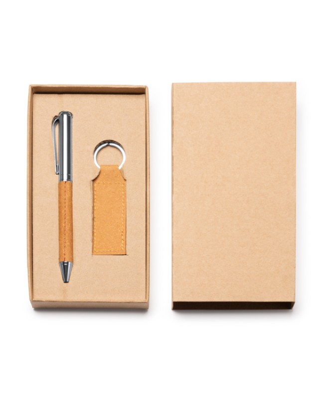 Penna a sfera e portachiavi in pelle riciclata con dettagli metallici. Inchiostro blu. Confezione in custodia ecologica. - Misure: [17,3cm/9cm/2,7Ø] - Composizione: Cuero reciclado - Presentación en estuche eco.