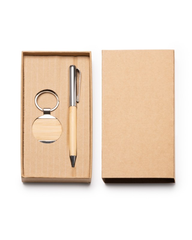 Penna a sfera e portachiavi in bambù con dettagli metallici. Inchiostro blu. Confezione in custodia ecologica. - Misure: [17,3cm/9cm/2,7Ø] - Composizione: Bambú - Presentación en estuche eco.