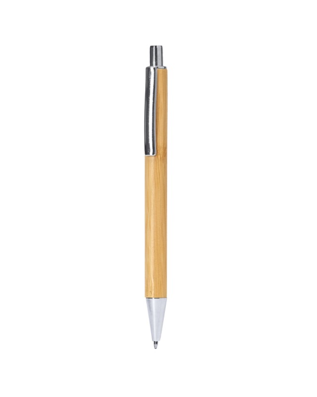 Penna della linea eco con corpo in bambù. Pulsante, clip e punta argentate. 1,0 mm di carica con inchiostro blu. - Misure: [13,9cm/1,1Ø] - Composizione: Bambù e plastico.