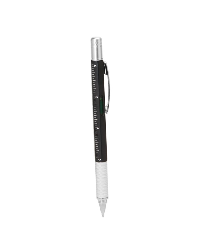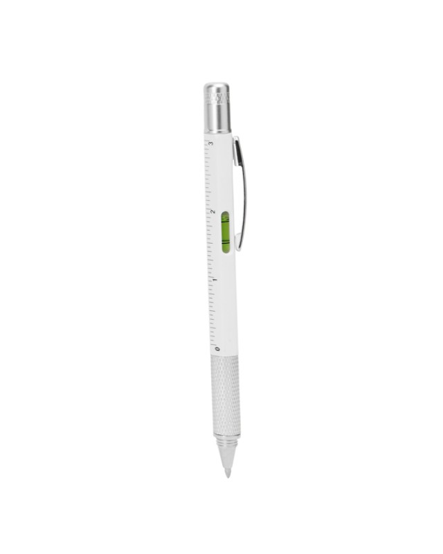 Penna multiuso con i seguenti strumenti: livella, righello in centimetri e pollici, cacciavite a testa piatta e cacciavite a stella. Corpo disponibile in vari colori. Meccanismo a rotazione. Refil blu. - Misure: [14,9cm/1Ø]