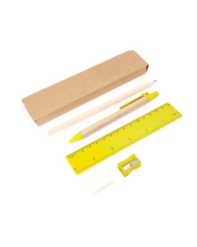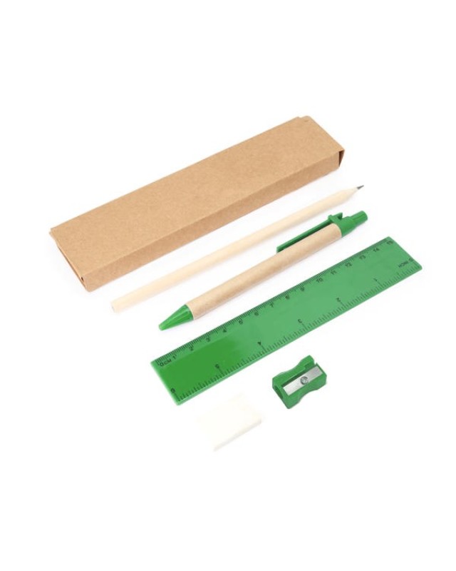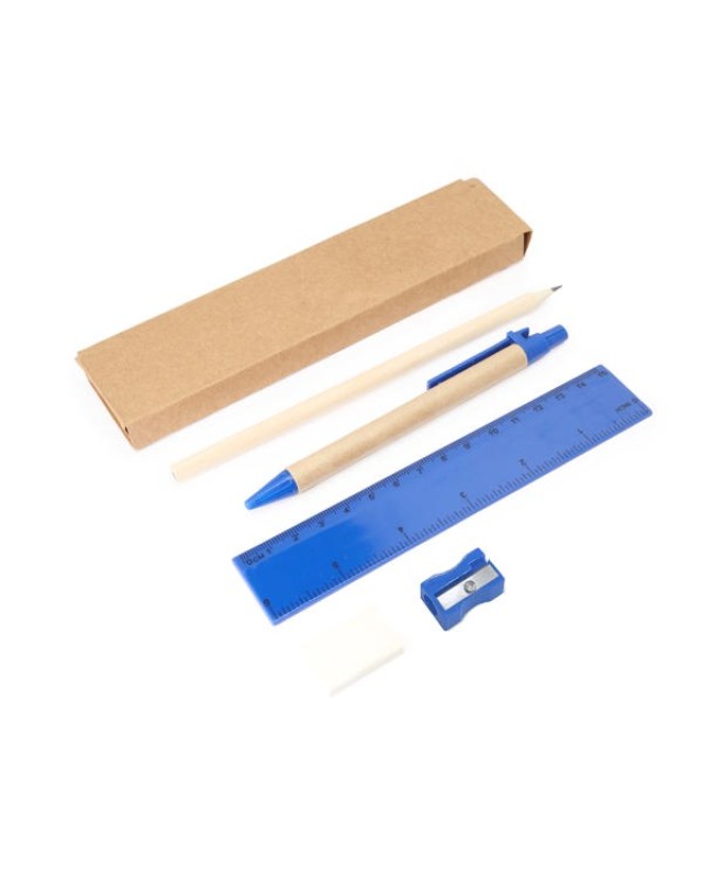 Set scrittura 5 pezzi custoditi in scatola di cartone kraft. Include penna con corpo in cartone e refil blu, matita in legno, temperamatite, gomma e righello da 15 cm. - Misure: [17,7cm/1,5cm/4,5cm] - Composizione: Cartone e plastica. - Refil per penna a sfera standard da 1,0 mm.Presentato in una scatola di cartone kraft.