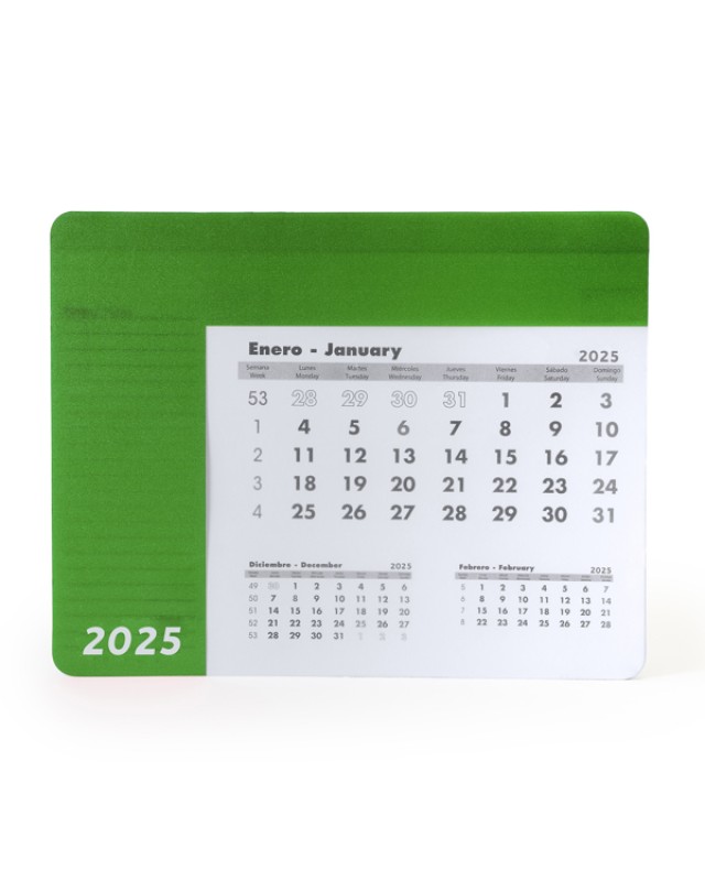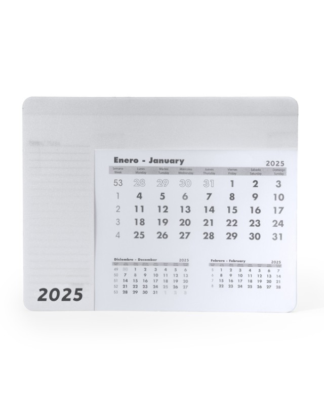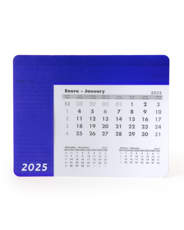 Tappetino per mouse rettangolare con calendario. Rivestimento colorato e trasparente, permette di vedere la relativa scheda del mese. Sollevando il rivestimento si accede al calendario di 12 schede in spagnolo e inglese, le cui pagine vengono staccate. Su ogni foglio mensile compaiono il mese corrente, il mese precedente e il mese successivo. Base nera antiscivolo. Peso carta 80 g/m². Spessore rivestimento 0,3 cm. - Misure: [23cm/18cm/0,4cm] - Composizione: Copertina: PPBase: EVACalendario: Carta