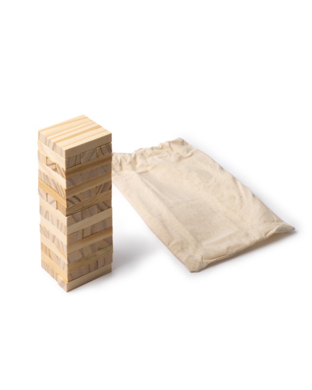 Gioco di abilità composto da 45 blocchi rettangolari. - Misure: [5,7cm/16,5cm/5,7cm] - Composizione: Legno e cotone - Presentato in un sacchetto di cotone con coulisse.