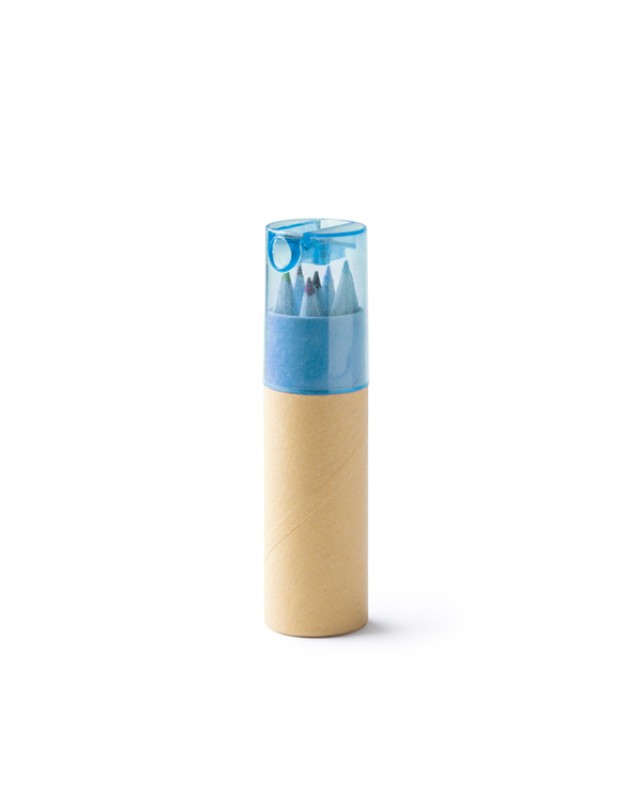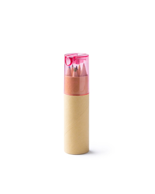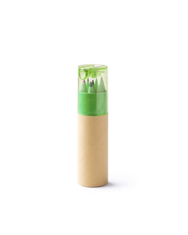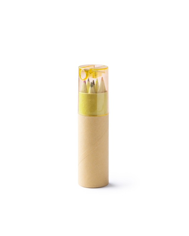 Set di 6 matite di legno in una scatola di cartone riciclato con cappuccio colorato traslucido. Include un temperamatite integrato nel cappuccio. Disponibile in vari colori. - Misure: [10,2cm/2,7Ø] - Composizione: Cartone riciclato.