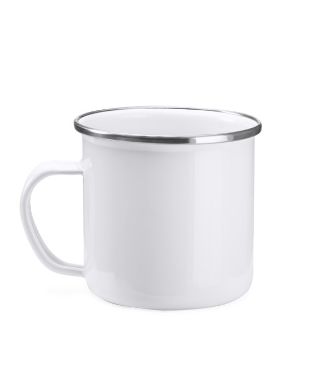 Fantastica tazza in metallo smaltato con bordo argentato, con capacità di 380 ml e rivestimento apposito per la sublimazione, in stile retrò. - Misure: [7,9cm/8,8Ø] - Composizione: Metallo - Confezione in scatola bianca.Si raccomanda il lavaggio a mano.