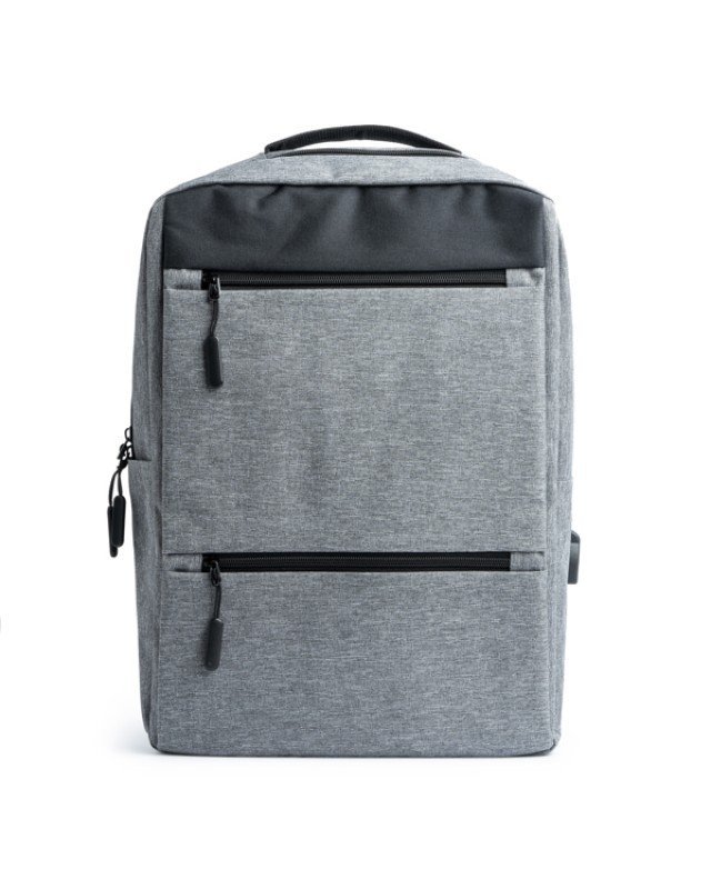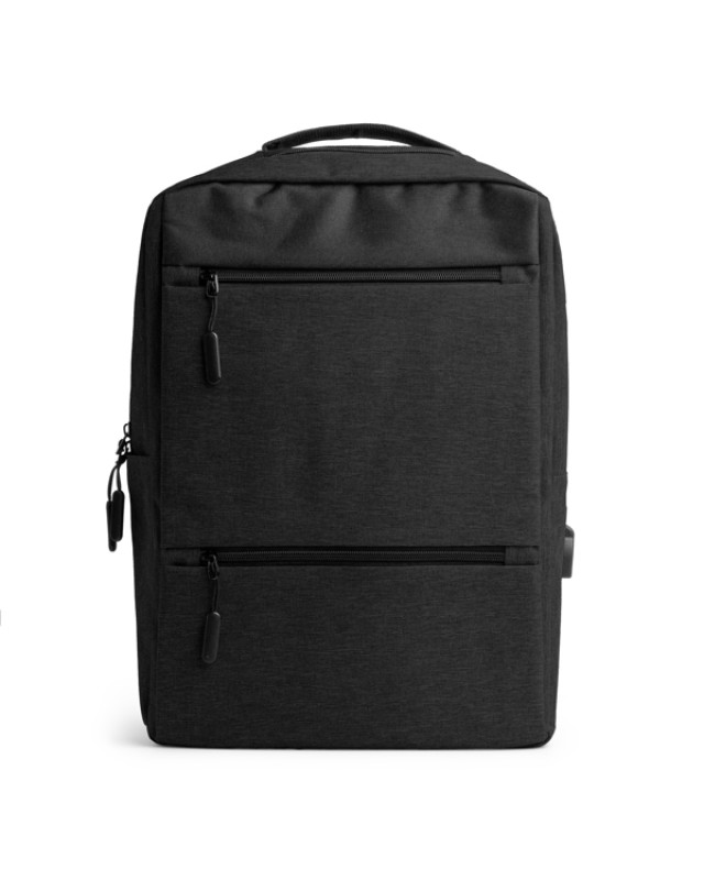Zaino realizzato in poliestere 300D. Design innovativo con finitura OXFORD. Tasca principale imbottita, ideale per il computer portatile, e due tasche anteriori con eleganti linguette. Porta USB integrata per il collegamento di un alimentatore portatile (non incluso). Spallacci e schienale imbottiti. - Misure: [31cm/43cm/16cm] - Composizione: 300D polyester.