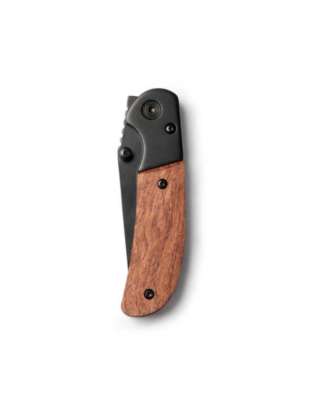 Coltello a serramanico in acciaio inox con lama nera e impugnatura in legno naturale. Chiusura di sicurezza. Confezione in scatola dal design ecologico. - Misure: [8,8cm/2,5cm/1,4cm] - Composizione: Stainless steel and natural wood. - Confezione in scatola di design ecologico.