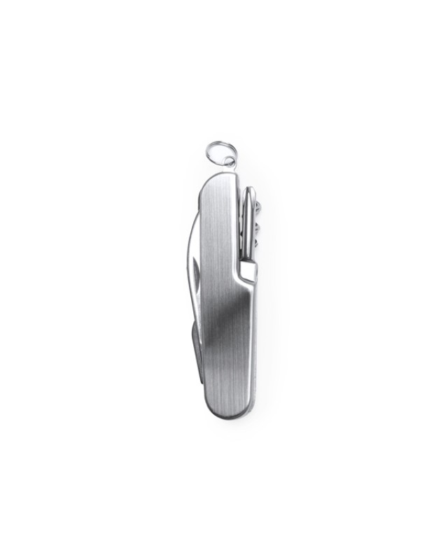 Coltello multiuso in acciaio inossidabile. con 6 funzioni: coltello, apriscatole, apribottiglie, cavatappi, cacciavite e portachiavi. - Misure: [7,6cm/2,1cm/0,7cm] - Composizione: Alluminio e acciaio inox. - Confezione in scatola bianca.