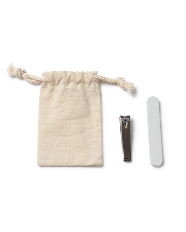 Kit per manicure in un astuccio di cotone con coulisse. Lima per unghie e tagliaunghie inclusi. - Misure: [12cm/7,8cm] - Composizione: Algodón