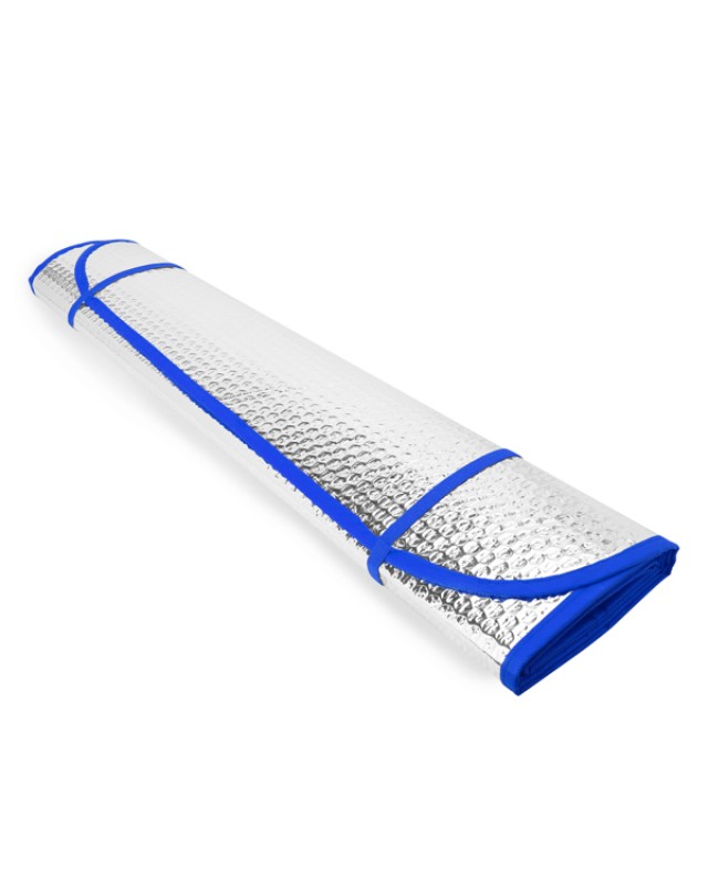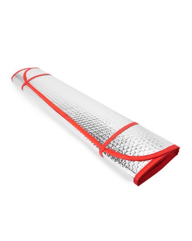 Parasole per auto con bolle su entrambi i lati in alluminio. Due fori in entrambi gli angoli superiori per l'inserimento di ventose da attaccare al finestrino del veicolo. Bordi ed elastici per arrotolarlo a colori. Fornito steso. Vendita in cartoni. - Misure: [130cm/65cm] - Composizione: Parasole: alluminio e foam da 230 g/m².Bordo: tessuto non tessuto.Anelli di tenuta: acciaio inossidabile. - Spessore: 2,5 mm.Vendita minima per cartoni.