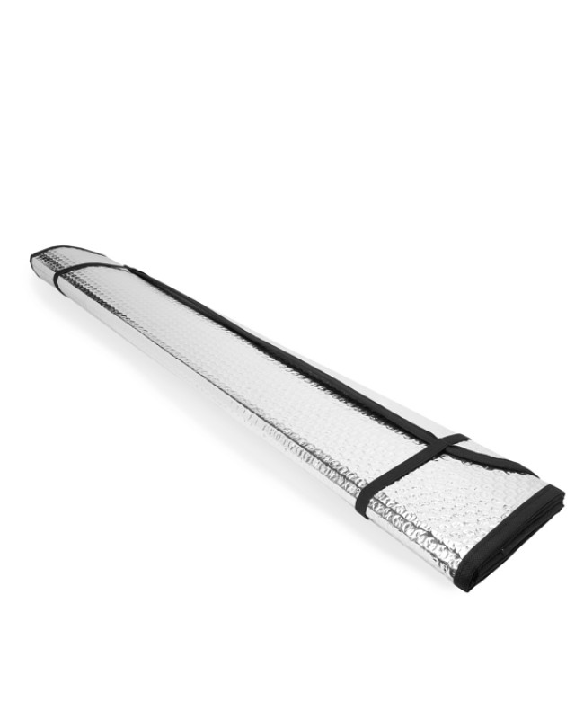 Parasole per auto in alluminio con bolle su entrambi i lati e bordi. Include pratiche ventose ed elastici neri per arrotolarlo. Fornito steso. Vendita per cartoni. - Misure: [130cm/80cm] - Composizione: Parasole: alluminio e foam da 250 g / m².Bordo: tntAnelli di tenuta: acciaio inossidabile. - Spessore: 2,5 mm.Misure: 130x80cmVendita minima per cartoni