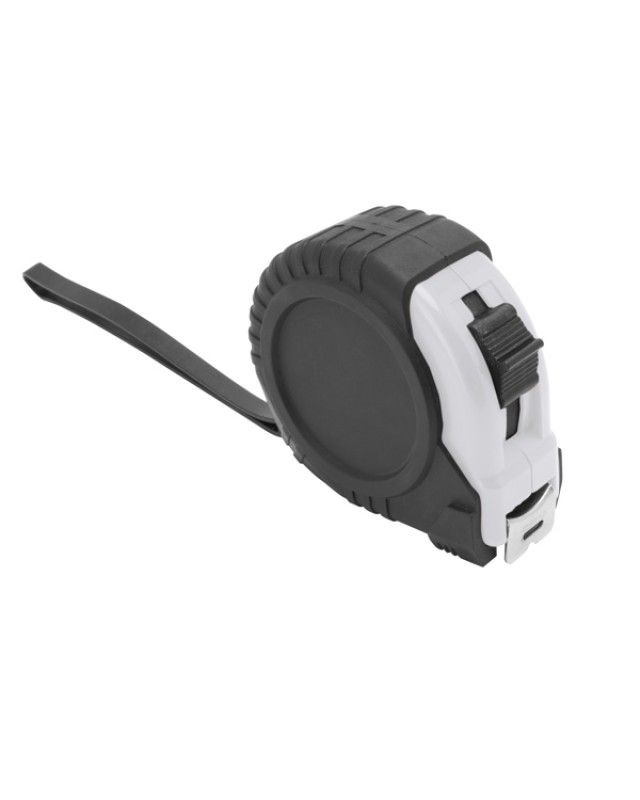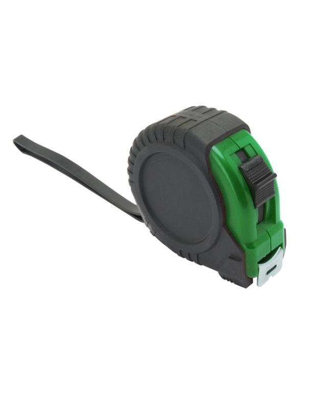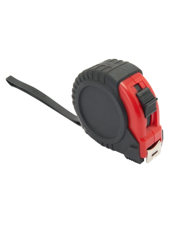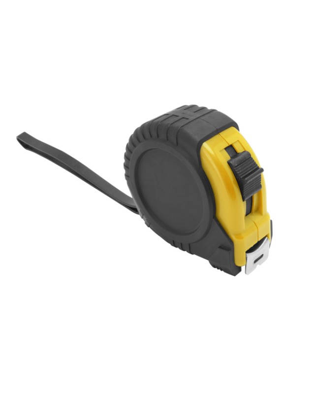Metro a nastro retrattile omologato da 5 metri con meccanismo di bloccaggio e nastro in metallo. Corpo colorato con copertura in gomma, clip in metallo e tracolla. Confezione in scatola singola. - Misure: [7cm/3,5cm/7cm] - Composizione: Plastica ABS con rivestimento in gomma. - Certificato CE Classe II.